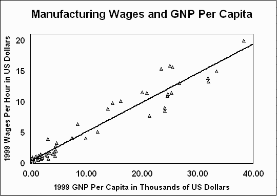 Notes: General: The selection of countries was based upon the availability of wage data for 1994 or later as reported in the Yearbook of Labour Statistics 2000, International Labour Organization (ILO), (Geneva: 2000), GNP data as reported in World Development Indicators, World Bank, 2000/2001, and exchange rate information. Wages: Wage rates were reported in the Yearbook of Labour Statistics 2000, ILO, (Geneva: 2000), Chapter 5B: Wages in Manufacturing. The years of the reported wage rates range from 1994 to 1999. Reported wages prior to 1994 were excluded from the analysis and all calculations. Wages reported by ILO in most cases are based on cash payments received from employers on a regular basis. In addition to remuneration for normal working hours, cost-of-living allowances and other regularly paid allowances are included in wages. Wages do not include remuneration for overtime, bonuses and gratuities, family allowances, or other social security payments made by the employer. See Yearbook of Labour Statistics 2000 for further discussion of wage data. Where monthly or daily wages were given, hourly wages were calculated assuming 24 working days per month, 5.5 working days per week, 8 working hours per day. Inflator: Wages were inflated, where the base year was not 1999, using the consumer price index (or wage rate index) data reported in International Financial Statistics, International Monetary Fund, May 2001. The inflator rate was calculated by dividing the consumer price index for 1999 by the consumer price index for the year the wage rate was reported. Exchange rates: In most cases, exchange rates were expressed as foreign currency per one U.S. dollar. All of the exchange rates used, except for certain European countries (i.e., Austria, Belgium, Finland, France, Germany, Italy, the Netherlands, and Spain), were as reported in International Financial Statistics, International Monetary Fund, May 2001. For these European countries, the Department relied on the exchange rate information it regularly obtains from Dow Jones B.I.S. and the Federal Reserve for the purpose of determining the daily exchange rates that are then posted to the Import Administration web site. The exchange rates used in the present analysis are a market average for the entire year. National Income: GNP, as reported in Selected World Development Indicators 2001, World Bank, 2001. See Selected World Development Indicators 2001 for further information. Analysis: Regression analysis is ordinary least squares analysis. |